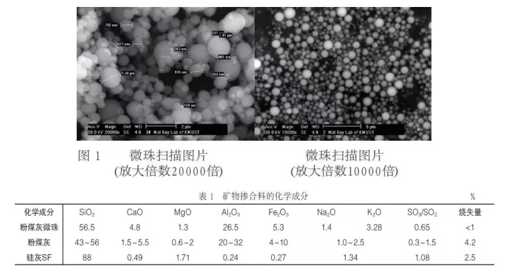 (2)粉煤灰微珠:内蒙古某厂生产的粉煤灰微珠,图1为微珠颗粒形貌,由图1可见微珠表面光滑,且均为标准球形,粒径大多分布于0.5~4μm之间,可以很好的填补水泥与硅灰之间的连续粒径分布的缺失。表1为微珠与粉煤灰、硅灰的化学成分,可见微珠中SiO2和Al2O3含量较粉煤灰高,各种非活性杂质较少,SiO2是玻璃体的主要成分,也是形成水化硅酸钙凝胶的主要来源,而粉煤灰中的SiO2、Al2O3对粉煤灰的火山灰性质贡献很大,一般含量越多,粉煤灰的火山灰活性越大。